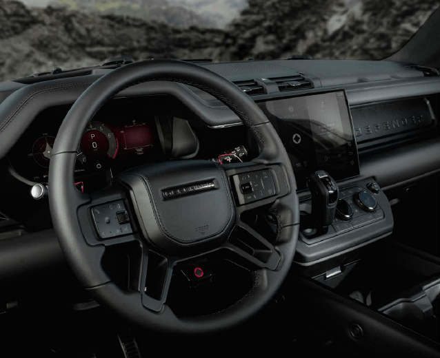 The black theme flows to the wheels and trim: buyers can choose between 20-inch forged wheels or 22-inch gloss black wheels with black centre caps and bespoke Defender script, while gloss black brake calipers add to the aggressive look. Satin black powder-coated undershields and scuff plates further reinforce the visual theme, blending form with a tough, utilitarian edge. Inside, Defender OCTA Black elevates luxury as assertively as it does style. For the first time in a Defender, Ebony Semi-Aniline Leather with Kvadrat™ upholstery is offered, pairing a soft, tactile finish with unique perforations and detailed stitching. The cabin’s cross-car beam is surfaced in Satin Black Powder Coat while an optional chopped carbon fibre interior brings an added layer of premium texture. Contrasting Carpathian Grey accents on seat backs and armrest hinges give a subtle visual depth that reinforces the feeling you’re in something pretty special.